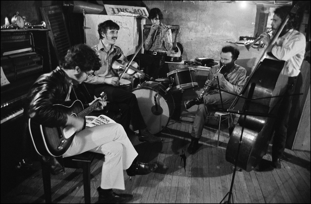 We took this for The Band album in the basement of Rick’s house on Chestnut Hill Road in Zena. Rick and Grace moved into this house after they got married. The Band wanted some real photos of themselves playing multiple instruments in their normal milieu. As with every other session we did, there was no precise plan. They played whatever instruments they felt like fooling around with, and I snapped away, documenting their process in a photo vérité style, which is how I nearly always photograph. It was a lot of fun so they just kept doing it, finding new instruments to include, re-positioning themselves and playing music. We had at least two sessions on different days. There are many more really good photos from these sessions but only space for a few in this book. Woodstock, NY, ’69