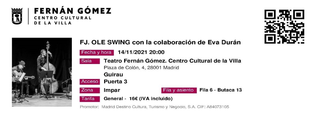 El Teatro Fernán Gómez tiene prohibidas las fotos y las grabaciones durante el concierto; por ello, sólo os puedo mostrar mi entrada, una imagen del escenario antes de iniciarse el concierto y el primer vídeo que he compartido, en el que interpretan «El Emigrante» (no es mío, aunque sí de aquella noche); el resto de fotos y vídeos no corresponden con este evento, pero estoy seguro que os ayudarán a haceros una idea de la excelente propuesta musical que nos ofrece Ole Swing, grupo formado por Paco Rivas, Fernando Bellver (guitarra), Roberto Jabonero (violín), Josemi Garzón (contrabajo) y Eva Durán (cante).